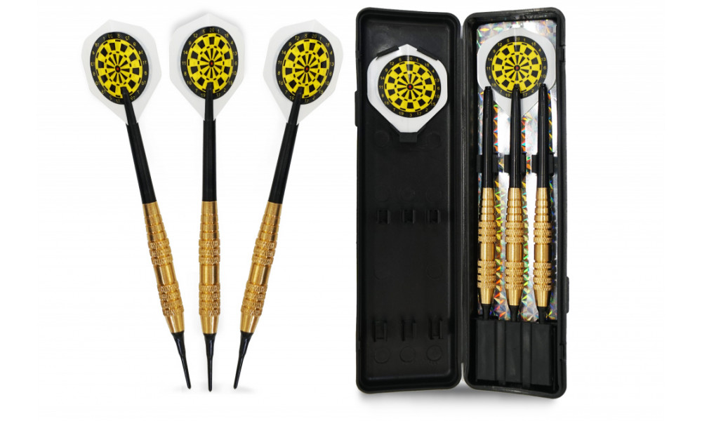 Дротики являются важнейшим элементом для игры в дартс, от их особенностей напрямую зависит уровень и качество игры. Комплект дротиков для игры в дартс среднего уровня из игровой серии VERGIN с пластиковыми иглами #40;Soft Tip Darts#41;. Комплект состоит из 3 дротиков весом 18 гр, баррель которых изготовлен из латуни. Латунные дротики являются общедоступным инструментом как для любителей, так и для профессионалов. Пластиковые хвостовики в сочетании с оперением отлично выравнивают дротики в полете. Пластиковые иглы #40;Soft Tip Darts#41; легко и надежно входят в мишень и идеально подходят для игры в электронный дартс. Комплект состоит из 3 баррелей, 3 хвостовиков, 3 оперений и кейса. Разборная конструкция дротиков позволяет заменить его хвостовик и оперение по мере изнашивания оборудования.
