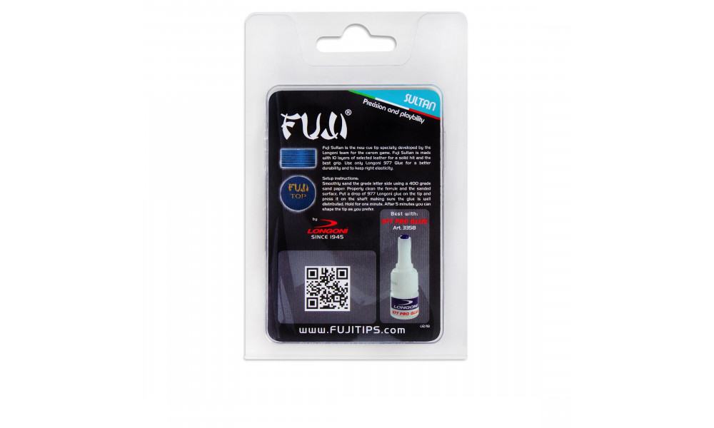 Многослойные наклейки Longoni Fuji производит один из старейших производителей бильярдного оборудования в мире - итальянская компания Norditalia. Наклейки изготовлены из десяти слоев спрессованной свиной кожи. Предлагаются в двух диаметрах - 13 и 14 мм - а также в трех градациях жесткости: мягкие, средние либо жесткие (Soft, Medium и Hard соответственно). В России марка Longoni традиционно популярна у поклонников русской пирамиды.